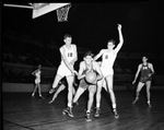Bob Hendricks (6) of Texas Christian University (TCU) taps Southern Methodist University (SMU)'s Harrold Salmon on shoulder in scramble for ball as Ponies defeated Frogs, 63-48. The tall boy at left is TCU's Frank Kudlaty. It was closing game. There are other unidentified players on the court and all players are wearing their school's jersey, sock with sneakers and some players have knee pads.The basketball net is to the left of the picture hanging from the backboard. Published in the Fort Worth Star-Telegram morning edition, March 4, 1948.