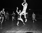 Texas Wesleyan's Doug Higgins leaps high for shot in Ram-East Texas State game. Other player is Lions' Troy Ingram. Wesleyans won, 77-56, to gain Texas NAIB finals. There are other unidentified players on the court and all players are wearing their school's jersey, sock with sneakers and some players have knee pads. Published in the Fort Worth Star-Telegram morning edition, March 6, 1948.