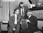 C.W. Woodman (right) receives Rotary Club plaque for lifetime work in peaceful labor-management relations in Fort Worth; J. Loyd Parker (left) and V.C. McNamee present the award, 04/15/1948. Woodman and Parker are seating each on a sofa and behind them is McNamee standing. On the background there is a candle stick with six candles and next to it there is clock.