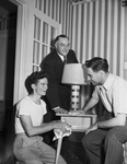 Image shows three members of the Methodist Students at North Texas Agricultural College (NTAC). Placing last touches on the new $19,000 Methodist Student Center at NTAC in Arlington are from left to right, Marvin Willis, president of the student center; Reverend C. A. Sutton, pastor of Arlington Methodist Church and Harvey G. Williamson, director of the center. Published in Fort Worth Star-Telegram morning edition April 25, 1948.