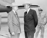 Left to right, Amon Carter and Symington. Both men are facing each other and talking. They are wearing suits and ties with hats. In the background, there is a man walking wearing a military uniform and the wing of an airplane.