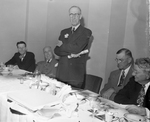 Left to right, Horace Lightfood, president, Fort Worth New Dealer; Amon Carter, A. P. Mithcell, County Judge Clarence Kraft and Sanford Webb. Mr. Carter is standing behind a table with plates, cutlery and cups on a table with other men seated beside him. They are wearing suits and ties and having conversations.