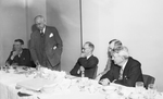Left to right, Horace Lightfoot, president Fort Worth New Dealer; Amon Carter, A. P. Mitchell, County Judge Clarence Kraft and Sanford Webb. Mr. Mitchell is standing behind a table with plates, cutlery and cups on a table with other men seated beside him. They are wearing suits and ties.
