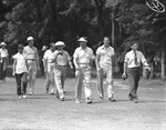 Ben Hogan (with soft drink) and Byron Nelson (center) walking fairway at Colonial Invitational Golf Tournament.