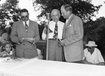 Three men are standing in front of a microphone at a table at the Colonial Golf Tournament. Mr. Clayton Heafner and Mr. Amon Carter are looking at a paper in Mr. Carter's hand. There is also a man to the right of Mr. Carter looking at some documents. Some of the men are wearing suits, ties, and collared shirts.
