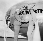Major General R. M. Ramey and Amon Carter. The men are standing sideways in front of an airplane while shaking hands and smiling. On the plane, "City of Fort Worth" is written. Mr. Carter is wearing suit and tie with a hat while General Ramey is in his military uniform.