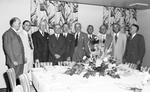 Left to right, F. E. Hatfield, Fort Worth; E. C. Bothwell, Pittsburgh; H. B. "Babe" Fuqua, Houston; S. A. Swensrud, Pittsburgh; Amon Carter, J. H. Russell, Houston; F. J. Adams, Fort Worth; Ben C. Belt, Houston; and N. H. Perry , Houston. The men are standing in behind a dinner table in a row with plates and cups and a flower center piece on the table. They are dressed in suits and ties.