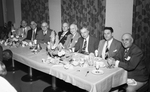 Left to right , Fred F. Florence, Dallas banker; R. R. Gilbert, Dallas; Fort Worth's Mayor Deen; Secretary of the Treasury John W. Snyder; Amon Carter, W. G. Vollmer, T & P Railway president; Delos W. Rentzel, Civil Aeronautic Administration national administrator; and E. L. Flippen, Dallas banker. The men are dressed in suits and ties and are seated at a dinning table with glass cups, tea cups and saucers in front of them. There are decorative flower pieces on the table. All the men look towards the camera smiling. In the background, there a curtains.