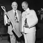 Amon Carter with Dr. R. B. Holt.The men are standing together. Mr. Carter is wearing a suit and tie and is holding a gold plated spade in his hand while he looks towards the camera and smiles. Dr. Holt is wearing a uniform and looking at the spade in Mr. Carter's hand.