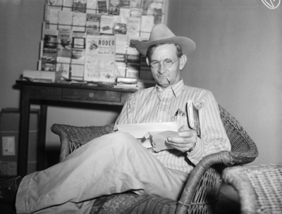 The seventh annual rodeo and horse show is being held in Midland, Texas. In the past, Hillery Bedford headed the parade committee and planned the opening day parade. This year, Mr. Bedford asked for time off and is enjoying the festivities as a spectator. He is sitting on a wicker chair, smoking a cigarette. He is dressed in a cowboy hat, striped button-up shirt, and trousers. There is a bulletin board with fliers in the background.