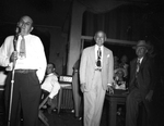 Left to right, unidentified man at mircophone,Amon Carter and unidentified man.The man at the microphone is talking while the other men are standing behind observing, There are people in partial view seated behind in the background watching. Mr. Carter and the man standing beside hgim are are dressed in suit s and ties wthe man at the microphone is wearing a collared shirt with pants and a tie