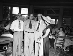 Left to right, 2 unidentified, Amon Carter , and unidentified women. The men are facing towards the camera while the woman is standing sideways. Mr. Carter is dressed in suit and tie while the other men have collared shirts with pants and ties. The woman is wearing a dress and a hat and is holding a purse. In the background, there are people seated at tables talking and eating.