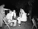 Left to right, 4 unidentified men and Amon Carter sitting.The men are seated on wooden chairs and stools outdoors at a picnic having a conversation.Some men are also standing. ome of them are dressed in suit and ties while others have collared shirt with pants