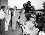 Crowd shot, with Amon Carter , Minnie Meacham Smith Carter.The men are outdoors at an event. Some of them are dressed in suit and ties while others have collared shirt with pants. The men are having conversations with one another. In the background, there are people seated at tables having conversations including Mrs. Carter.