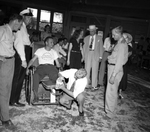 Crowd shot, Amon Carter. Amon Carter standing with a group of unidentified people watching as a male wheelchair user's toe is being observed by a man wearing a collared shirt and tie.