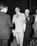 Texas Governor Beauford Jester greets Tom Tyson of Corsicana, Texas at the Texas Democratic Convention. Congressman Sam Rayburn is to the right of Jester.
