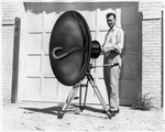 Tom Bedford, WBAP-TV engineer, with a microwave relay transmitter for televising football games after 09/21/1948.