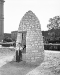 Frenchman's Well cover, 99 years old, being inspected by Ronnie and Charles Kelsey, after being moved to a new site on the west side of County Courthouse.