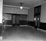 Shot of Mr. Carter's office entrance and entrance to oil office. The picture is taken in the hallway showing the doors to the offices. Directly in front is a double door with two windows to the side with wooden frames and to the side is another door with windows at the top of the door. There is a light hanging from the ceiling in the hallway.