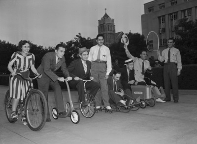 On their mark to sell season ticket books to 1940-41 Footlite Club attractions, left to right: Miss Maybell Criner, Bob Hamilton, Charles Tate, Jimmy Birdwell, and Code Edwards, team captains; Curtis Thomas and I.E. McWhirter, who are pledged to sell 86 books apeice, and Ed Eckert, president, cracking the whip. Each five-member team has a goal of 100 books to sell by October 1, and the winner will be honored with a party. The dramatic club is sponsored by the Co-Workers Class of First United Methodist Church, of which McWhirter is teacher, and proceeds from the plays go to church work. This will begin its eleventh season. All members but the president, Ed Eckert, can be seen on a piece of sports/leisure equipment: a bicycle, a scooter, a tricycle, roller skates, a sled, a toy tractor, and a rocking horse.