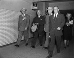 President Harry Truman (second from left) visits Fort Worth; he walks through the T&P railway station with Raymond Buck (left), Amon G. Carter (second from right), and Governor Beauford Jester.