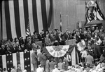 Texas Governor Beauford Jester endorses President Harry Truman for re-election; center podium from left, Amon Carter, Harry Truman, Sam Rayburn; 2nd row, Mabel Jester, Margaret Truman, Nenetta Burton Carter, Betsy Truman, 09/27/1948. The dias is crowded and there is a very large American flag hanging on the wall behind the podium.