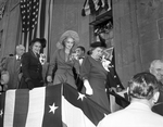 President Truman's visit to Fort Worth. Left to right: Amon G. Carter, Margaret Truman (daughter of U. S. President Harry Truman), Minnie Meacham Smith Carter (wife of Mr. Carter) and Bess Truman (wife of President Truman). All three women have flowers pinned to their blouses. The group is standing on a viewing platform.