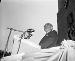 President Truman's visit to Fort Worth. President Truman is seen standing at the podium, speaking into a microphone.