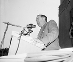 Raymond Buck at mirophone. Mr. Buck is standing at the podium speaking with the microphone. He is wearing a suit and tie with a handkerchief in his pocket.