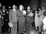 Left to right, Raymond Buck, Beauford Jester and President Harry Truman.The men are dressed in suit and ties.They are holding hats in their hands and some of the men have their hats placed close to their chest.