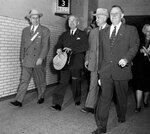 Left to right, Raymond Buck, President Buck, President Truman, Amon Carter and Governor. Jester.The men are walking down a hallway. They are wearing suits and ties
