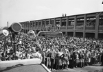 Crowd shot showing Star-Telegram WBAP-TV Channel 5 truck in foreground. There is a crowd standing outdoors, some at the veranda of open building while a few stand on top of a building roof. There are also people recording the event standing on the Fort Worth Star-Telegram bus.