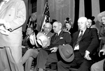crowd shot. Amon Carter is seated beside other unidentified men and women at an event. They are all dressed formally. In the background , there are flags of the United States of America. In front of the people seated, there is a man standing, who is in partial view.