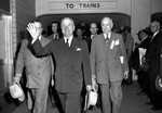 Left to right, unidentified man, President Truman and Amon Carter. The men are walking side by side. They are dressed in suits and ties. Some of the men are holding hats in their hands. President Truman is waving at the people he passes by. There are men standing behind them and some are standing to the side.