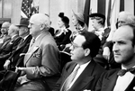 Crowd shot. Amon Carter and a group of people seated at an event. There are men and women present. The men are wearing suit and ties while the women are wearing suits and hats with flower corsages attached to their shoulders. In the background, there is an American flag at the side.