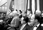 Crowd shot. A group of people seated in the audience all dressed in different formal attires The men are wearing suit and ties while the women are wearing suits with hats and flower corsages attached to their shoulder. In the background, there are American flags and banners.
