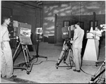 WBAP-TV two cameramen with stage hand preparing television set, 09/28/1948.