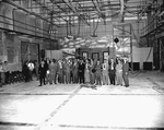 Crowd shot with lights hanging over head. A group of men are standing together in rows and posing for the photograph. They are all dressed in business attires that constitutes: a suit, tie, inner collared shirt with some of them wearing hats and some also having eyeglasses