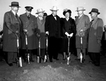 Left to right John W. Carpenter, Dallas president of Trinity Improvement Association. Colonel Henry Hutchings Junior, John M. Fouts, TIA manager; United States' Senator Tom Connally, principal speaker; Mrs. Connally, Amon Carter, and an unidentified man. They are each holding a silver spade in their hand and are standing in a row while they are smiling and having conversations.