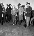 Amon Carter with 2 unidentified men, with spades. Mr. Carter is resting his elbow on the spade handle while leaning forward and has his right foot on the head of the spade. There is an unidentified man beside him who he is looking at. The man is holding a spade above the ground while another man in military uniform stands beside him with his spade dug in the sand. Two of the men are wearing suits and ties with hats and overcoats while the other man is in his military uniform. There are other unidentified people in the background holding spades and having conversations.