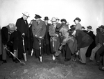 Amon Carter, unidentified crowd shot, digging. Amon Carter and a group of men digging. Mr. Carter is resting his elbow on the spade handle while leaning forward and has his right foot on the head of the spade. Most of the men are wearing overcoats on their suits and tie with hats while a few are wearing their military uniform. There are other people in the background having conversations.