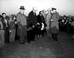 Crowd shot. An unidentified man is raises up a silver spade with sand in it while an audience watches. There is a woman standing beside the man holding a newspaper and her purse. Beside the woman are Amon Carter and two other unidentified men watching.