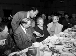 Amon Carter Junior handing silver dollar to Mrs. Nancy Crouch. Her husband, Doc Crouch, is at left. Mr. Carter is standing behind Mrs. Crouch's chair and is bent over handing the money to her. The men are wearing suits and tie while Mrs. Crouch is wearing a v-neck dress. Mr. and Mrs. Crouch are seated at a dinner table with other unidentified people. They have plates of food and cups with drinks in front of them. In the background, there are people seated at other tables.