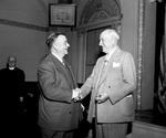 Amon Carter senior talking to a member of the Elks Club. The two men are shaking hands with each other and smiling. They are both wearing suits, ties and inner collared shirts. In the background, there is an unidentified man wearing a cleric's collar.