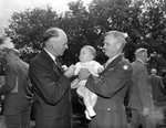 North Texas Agricultural College's inauguration of Ernest H. Hereford as the school's first president. Dr. Hereford's grandson, James Philip Miller II, 9 months, is pictured being held by General Thomas T. Handy, 4th Army commander, at right.