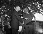 North Texas Agricultural College's inauguration of Ernest H. Hereford, left, as the school's first president with Texas A&M President Gibb Gilchrist at right.