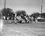 Image shows a football game between North Texas Agricultural College (NTAC) and John Tarleton Agricultural College. In center, NTAC players are shown around John Tarleton's player, James Payne, arm shown extended outward, carries football for six yards in first quarter at Stephenville. In tackle, are Don Peterson, on top, Dick Cavazos (60) and M. D. Jones below. Tarleton's, Whitewell (14) is on right of center. In background is a house and a unidentified crowd. Published in Fort Worth Star-Telegram morning edition November 20, 1948.