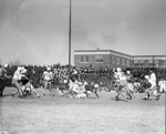 Image shows a football game between North Texas Agricultural College (NTAC) and John Tarleton Agricultural College. Fourteen football players and one unidentified referee, far right are shown to be performing a play in front of a unidentified crowd seated in bleachers.