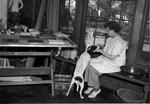 Evaline Sellors in her art studio with her dog at home in Fort Worth, Texas.
