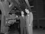 Gordon "Tex" Beneke with his father, F.S. Beneke, pointing at machine during tour Fort Worth Star-Telegram plant, 12/11/1948
